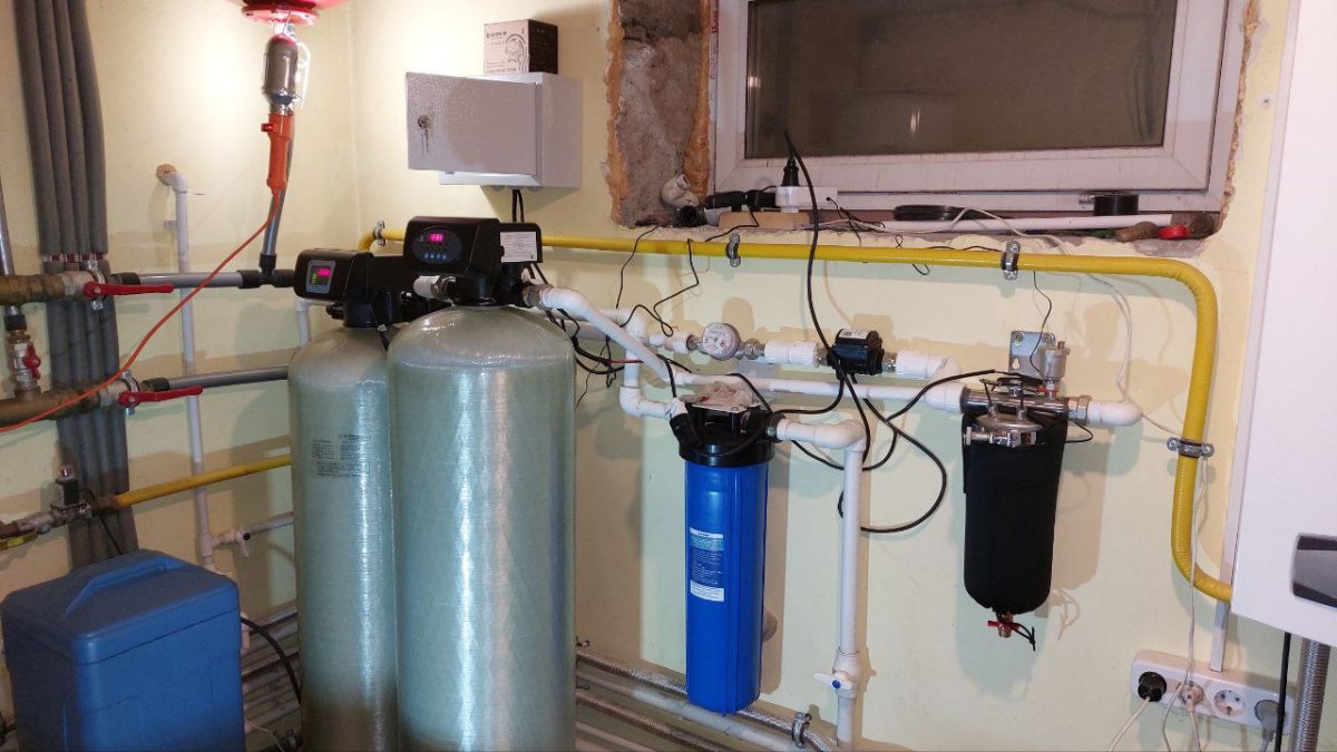 Базовая схема "ЭСО-1.5". Проживание 3-4 чел. Fe: 3,98 мг/л. Жесткость: 6,0 мг/л. Мn: 0,8 мг/л.