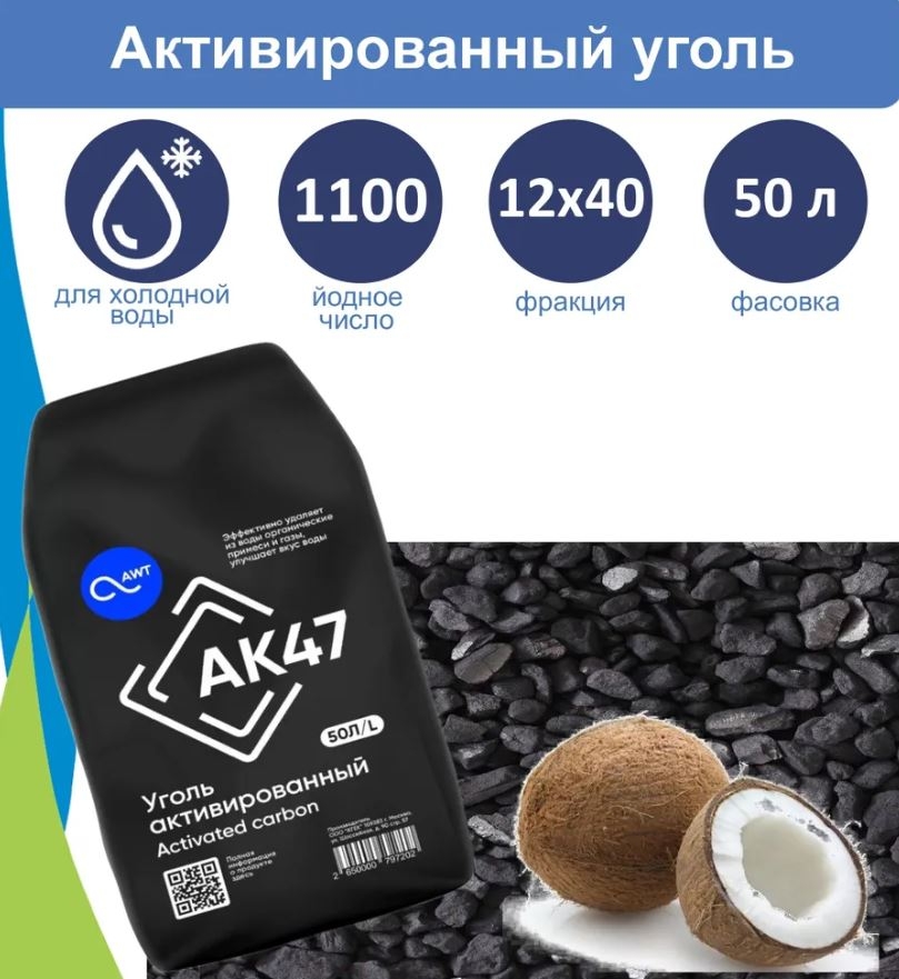 Фильтрующий материал активированный уголь AK47 12x40 (50л). Скорлупа кокоса.