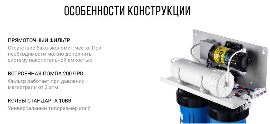 Высокопроизводительный обратный осмос без бака Осмос-Лайн 4000 работает без накопительного бака: мембрана 1000 GPD и насос обеспечивают высокую скорость фильтрации. Отсутствие накопительной емкости экономит место: фильтр можно установить под мойкой. В комплекте надёжное металлическое крепление, можно закрепить систему к стене или установить на любую твердую поверхность. При необходимости можно дополнить схему водоочистки гидроаккумулятором.