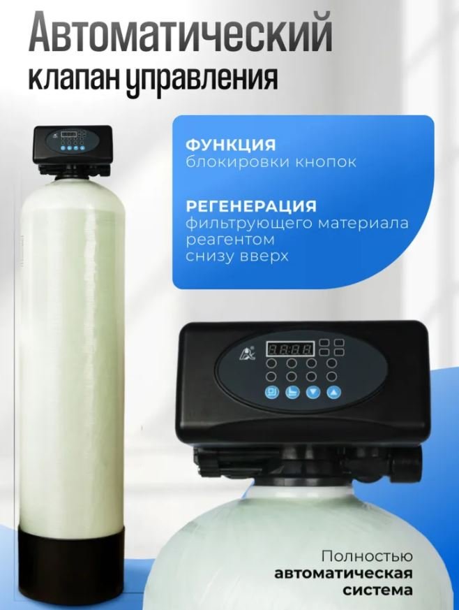 Фильтр оборудован автоматическим програмируемым клапаном RUNXIN-1354 TM.F65Р3, с помощью которого фильтр самостоятельно по мере необходимости проводит регенерацию в удобное для пользователя время.