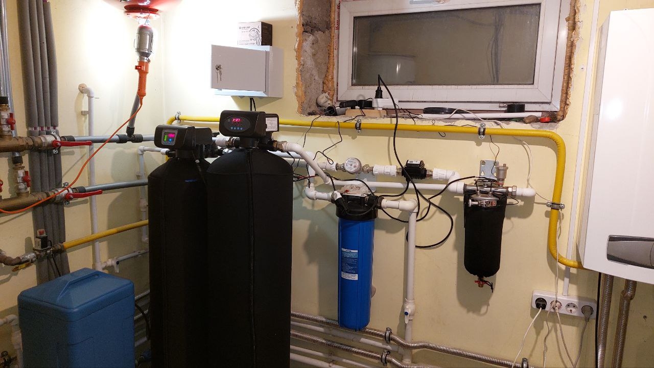 Базовая схема "ЭСО-1.5". Проживание 3-4 чел. Fe: 3,98 мг/л. Жесткость: 6,0 мг/л. Мn: 0,8 мг/л.